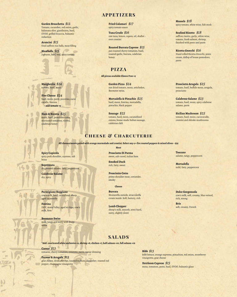 San Marzano tomato, fior di latte mozzarella, basil, mixed mushroom, kalamata olive, capers, cacio cavallo and caponata.